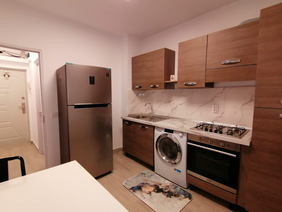 Camera este dotata cu pat matrimonial, dressing cu multiple spatii de depozitare, comoda TV, 2 noptiere, aer conditionat Mitsubishi de 12.000 BTU si televizor. Bucataria este dotata cu mobila moderna si echipata cu plita marca Bosh, cuptor electric Hotpoint, frigider Samsung, masina de spalat Candy cu uscator, hota, masa de 2 persoane. Baia este si ea complet renovata avand toate obiectele sanitare noi si cabina de dus cu scurgere in pardoseala.